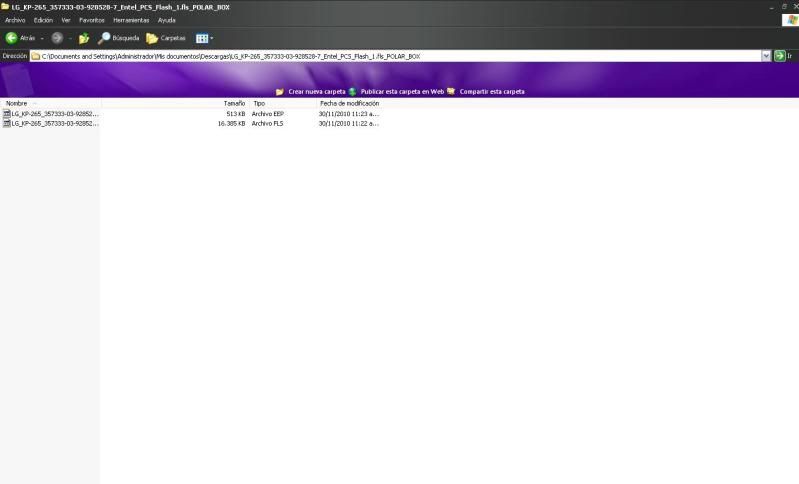 Link Alternativo: http://www.4shared.com/file/nRppeckA/LG_KP...928528_7_E.html amigo le pase la flash, el celular prende y se queda en KP265 y no avanza. crees que haya solucion aún |