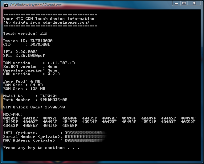 para sacar informcion de su cl El Info siguiente será demostrado: - CID - IDENTIFICACIÓN DEL DISPOSITIVO - Tamaño del RAM - Tamaño de la ROM - IPL - SPL - Número de parte de HTC - 15 dígito IMEI (NOTA: Sus informes de información de System->Device 2 dígitos adicionales que indican la revisión del software) - Número de serie - Códigos de MCC+MNC ![]()