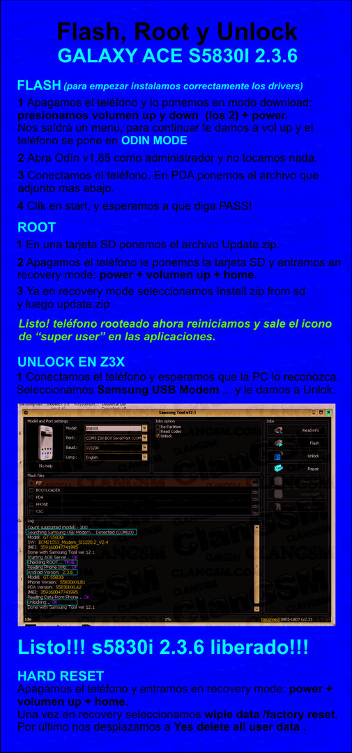 Hi Solo hagan esto y se soluciona el problema, también cambian el serial por original para arreglar el imei , allí también están los archivos Daniel http://www.clangsm.com/forum/index.php?showtopic=256557 esa version de odin y esa flash aplica para s5830i y para s5830m el compañero tiene el s5830L ese modelo ni siquiera entra con las 2 teclas de volumen ese modelo se pone en modo download con tecla central y power ... Y solo si es telcel se flashea para que lo reconosca z3x...sin nesecidad de root...solo se pone *#7284# y se configura si no entra esa combinacion no conectara a la box..saludos -------------------- “Sé paciente y no pretendas que llegue todo de inmediato”