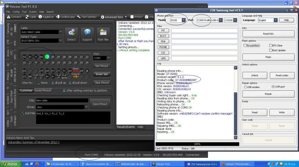 -Abrir Volcano box -Ir a la pestaña DETECT.. ahi asignaremos el siguiente pinout: 1:vcc, 2:rx, 3:tx, 4:rea, 5:gnd y en el mismo 5:reb. ahi pedira el valor de resistencia, colocan 510 (para este s3) -dar click en Set Pinout -Ir a la z3x (lo hice con esta box, puede salir con cualquier otra q tengan) y seleccionar el puerto com que tenga asignado la volcano, en mi caso COM3 (mirar foto abajo) -Seleccionar i9100.. (en las ultimas versiones, con el i9300 no tiene habilitado el boton REPAIR, con el i9100 funciona igual) (primero se trabaja con cable usb) -Encima del boton Repair, sale usb modem y com port... seleccionen "com port" y le dan repair.. y marcan lo que necesiten reparar: serial, s/n, product code, etc.. y marcar la casilla de Repair EFS (en mi caso solo serial que estaba corrupto) -Al dar click en OK, comenzará la reparación.. (telefono debe estar rooteado y con la depuracion usb activada) -Cuando en el log aparezca: rebooting phone.. ok, desconectan el cable usb.. y conectan el cable de la volcano al s3 con la punta microusb P-05B. solo este extremo, aun no conecten el cable de 26 pines a la caja volcano.. OJO AQUI.. -cuando encienda el cel.. escriban #*9090# y seleccionen la opcion 2.. ahi mismo sin desconectar, boton power y marquen Reiniciar... esperar q el cel encienda nuevamente -Cuando el cel este completamente encendido atentos al log de la z3x que diga "checking phone at COMx" en ese momento, conecten la punta principal del main cable (26 pines) a la volcano y ahi les dira a los pocos segundos "checking phone at COMx... OK" -Ahi verán como en pocos segundos repara todo... Sale a la primera siguiendo los pasos Cualquier duda pregunten... dejo captura y foto de las operaciones... ![]() atentos a los ovalos negros... son pequeños detalles.. pero deben seguirlos... ![]() Imei restaurado señores... Si tienen dudas o si no les agarra la red o cualquier detallito, o como rootear este s3.. con gusto atenderé.... Mensaje modificado por vickcar13 el Dec 21 2012, 08:29 PM |