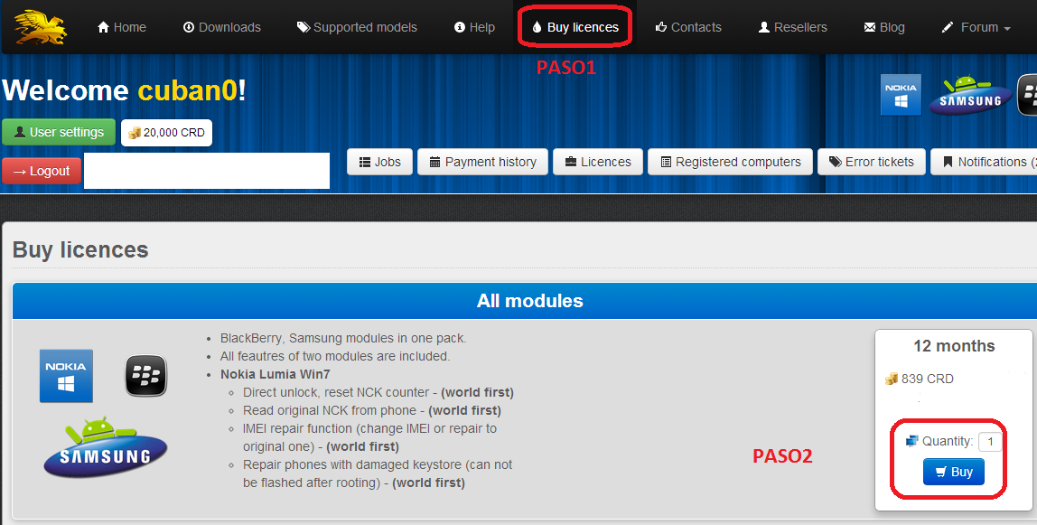 al comprar la licencia de un año :::::::::::::::::::::::::::::::::::::::::::::: 165 dolares te dan con 839 creditos... para activar todos los modulos chimera (samsung, nokia, BB) ::::::::::: te consume 839 creditos si hacemos una sencilla resta, despues de activar el pack completo ::::: te quedaria 0 creditos... a buen entendedor pocas palabras... si luego de esto compraste mas creditos y no aparecen, ese ya es otro tema.... saludos -------------------- |