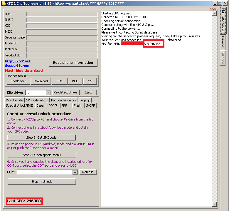 Volumen + Volumen - y power Seleccionar BOOT TO DOWNLOAD MODE En la XTC Ir a la pestaña Bootloader Unlock y clic en Unlock Bootloader ![]() En el Teléfono Verán lo siguiente: ![]() Presionan Volumen Arriba que es el equivalente a YES Presionan Power para confirmar El Teléfono se va a reiniciar y se va a BORRAR Pasar toda la pantalla de bienvenida y llegar hasta el menu. Habalitar Depuracion y Unlock OEM apagamos y volvemos a presionar Volumen + Volumen - y power Seleccionar BOOT TO DOWNLOAD MODE En la XTC nos pasamos a la pestaña SPRINT Seleccionamos Step 2: Get SPC Code ![]() Ahora ya tenemos el SPC, En la HTC seleccionamos Reboot En el HTC Marcamos ##3424# y nos pedira el SPC, lo tecleamos Nos Dira: Successful, Seleccionamos DISMISS ![]() Encendemos estas dos opciones: DM y SERIAL ![]() En la XTC Seleccionamos el puerto que se genero, si no aparece es por que no estan bien puestos los drivers. Aqui en este post dejo los drivers. Clic en Step 4: Unlock ![]() LISTO.!!! Mensaje modificado por motursa el Feb 22 2017, 10:47 PM