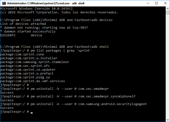 OK, actualizando estos son los comandos completos: Procedimiento: 01) Instalamos el Minimal ADB en Windows y luego en opciones de desarrollador que debemos activar, habilitamos la depuracion USB. 02) Conectamos el Teléfono con el cable a la PC 03) Abrimos la ventana de comandos con el ADB Escribimos lo siguiente: CÓDIGO adb devices Si todo sale bien, si tenemos el teléfono conectado, debe devolvernos una instancia de conexión, de dispositivos conectados ONLINE en nuestro PC 04) Buscamos si tenemos los paquetes de Sprint instalados, escribiendo el siguiente comando: CÓDIGO Adb Shell Luego de entrar al entorno de ADB, procederemos a buscar los paquetes... CÓDIGO pm list packages | grep 'sprint' 05) Instalamos el APK de APP Inspector en el Teléfono y buscamos los paquetes encontrados, para el caso de Sprint, buscamos los paquetes siguientes: SPRINT OMADM y SPRINT OMADM INTERFACE Los seleccionamos y vemos los detalles de la APK de sprint que tenemos instalado en el teléfono. Para el caso de Sprint, tenemos dos paquetes, omadmspr y syncmlphoneif, entonces los borramos desde la línea de comandos en la PC, uno a uno y le damos Enter para confirmar. CÓDIGO pm uninstall -k --user 0 com.sec.omadmspr Y por último: CÓDIGO pm uninstall -k --user 0 com.sec.omadmspr.syncmlphoneif