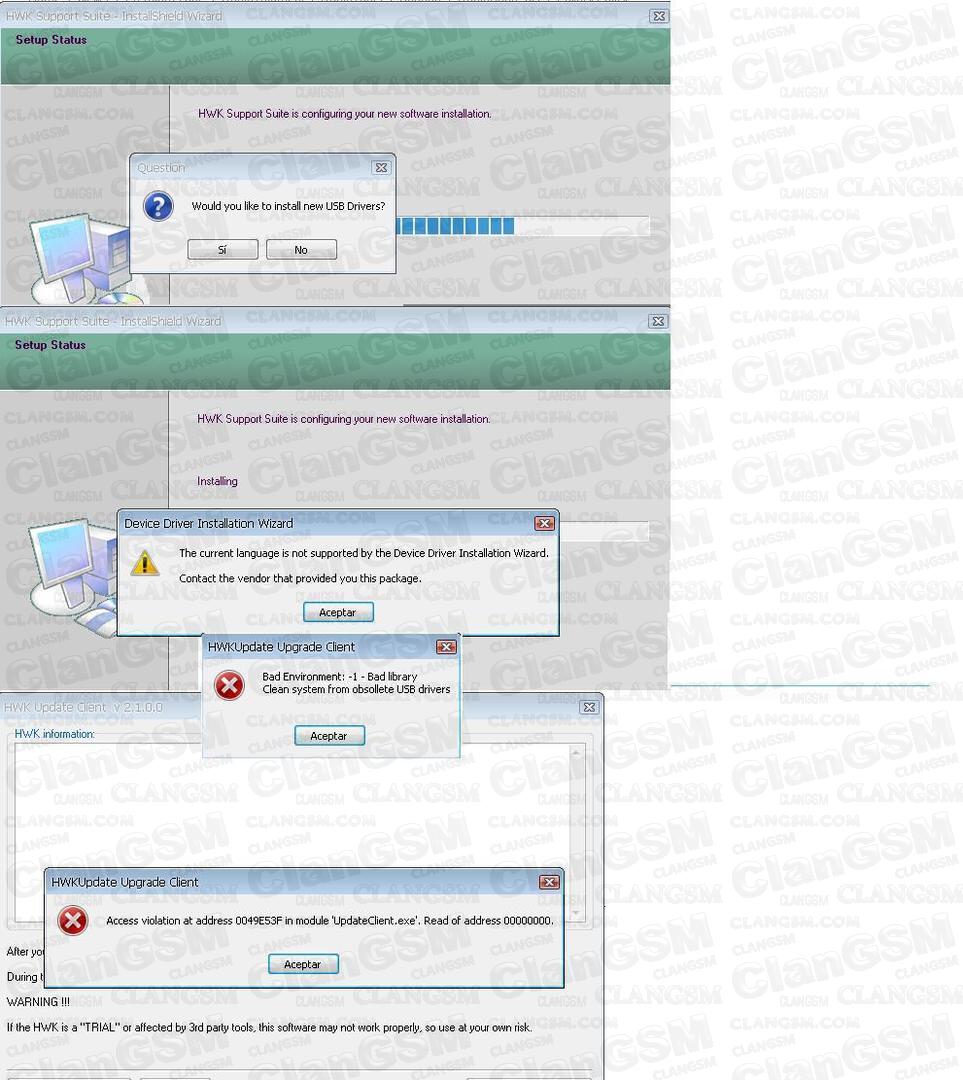 como esta posteado al principio tenemos que tener todos los programas a instalar en una sola carpeta con HWK Support Suite y el HWK_Support_Suite_Setup estos deben ser la misma versión hagan todo el proceso como esta en la pagina 1 de esta guia y debe quedar lista su caja para trabajar. que no debemos hacer y porque nos marca estos errores ![]() este error es porque tu caja no es original y el soporte esta detectando que esta tratando de actualizar demasiadas veces la misma serie desde diferentes ip el siguiente error son problemas de driver ya que no esta instalando con los últimos disponibles actualizalos deben de estar en C:\Archivos de programa\SarasSoft\UFS drivers ufs el siguiente ![]() estas instalando primero el suit setup debes primero instalar siempre el hwk update para actualizar tu caja y después que se actualice con éxito entonces instalas el suit setup y después sus respectivas actualizaciones o módulos. y ahora el dolor de cabeza de todos ![]() esto nos pasa por desesperados yo tarde una semana en entenderlo y de aquí se derivan los demás problemas como el -9 el de licen false o el hwk death ya que muchos en la desesperacion empezamos a bajar cracks, clonadores de serie, etc tantas cosas que hay en la red. [/size][/color] por favor no hagan nada de eso esto es mas facil de resolver de lo que en verdad parece, si usan esos programas terminaran mas frustrados y tirando sus box [color="#008000"] la solución es la caja solo se puede actualizar una ves cada 24 hrs a partir del primer intento, si se equivocaron de version y actualizan y pusieron una mas viejita del suit usen esa, no traten de desinstalar he instalarla el mismo día por que no lo van a poder hacer, si estan insiste e insiste actualizar el mismo dia el servidor tomara esto como un intento de clonacion de esa serie y terminara dando de baja su caja. y no podrán usar el servidor ni el programa de hwk [size="7"] dejen pasar 24 a 36 hrs antes de intentar actualizar el hwk otra ves y solo se permite una sola vez y con una sola versión del programa no tiren su dinero ala basura y tengan paciencia. Mensaje modificado por framar el Feb 22 2011, 12:50 AM -------------------- “La mayoría de la gente ve lo que es, y nunca ve lo que puede ser.” - Albert Einstein